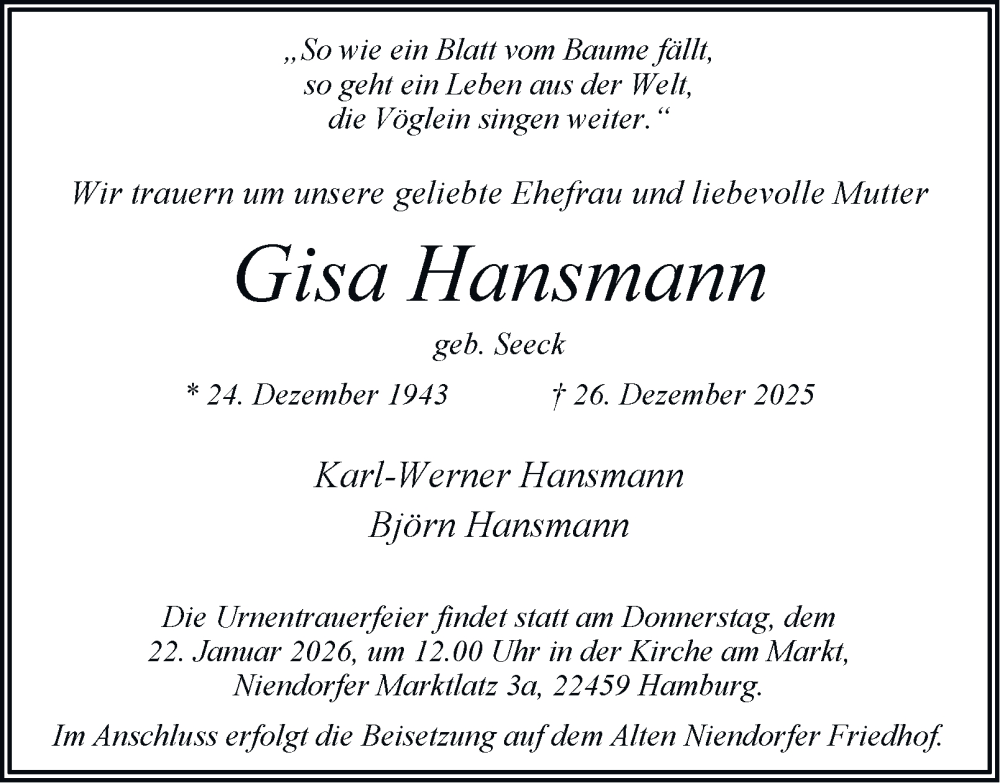 Hier finden Sie alle Traueranzeigen aus der Zeitung, die bisher für Gisa Hansmann erschienen sind. Weitere Traueranzeigen, die in der Zeitung erscheinen, werden hier ebenfalls aufgelistet