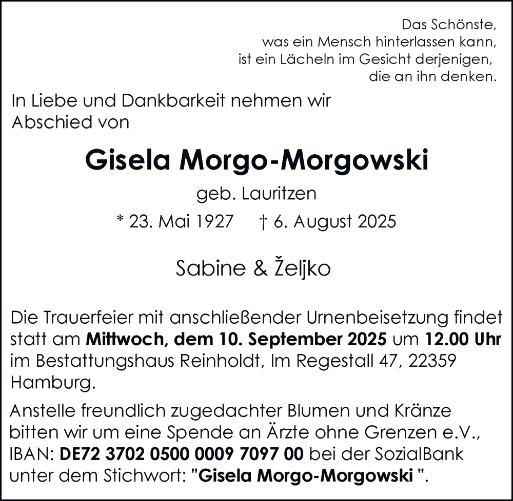 Hier finden Sie alle Traueranzeigen aus der Zeitung, die bisher für Gisela Morgo-Morgowski erschienen sind. Weitere Traueranzeigen, die in der Zeitung erscheinen, werden hier ebenfalls aufgelistet