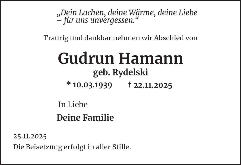 Hier finden Sie alle Traueranzeigen aus der Zeitung, die bisher für Gudrun Hamann erschienen sind. Weitere Traueranzeigen, die in der Zeitung erscheinen, werden hier ebenfalls aufgelistet