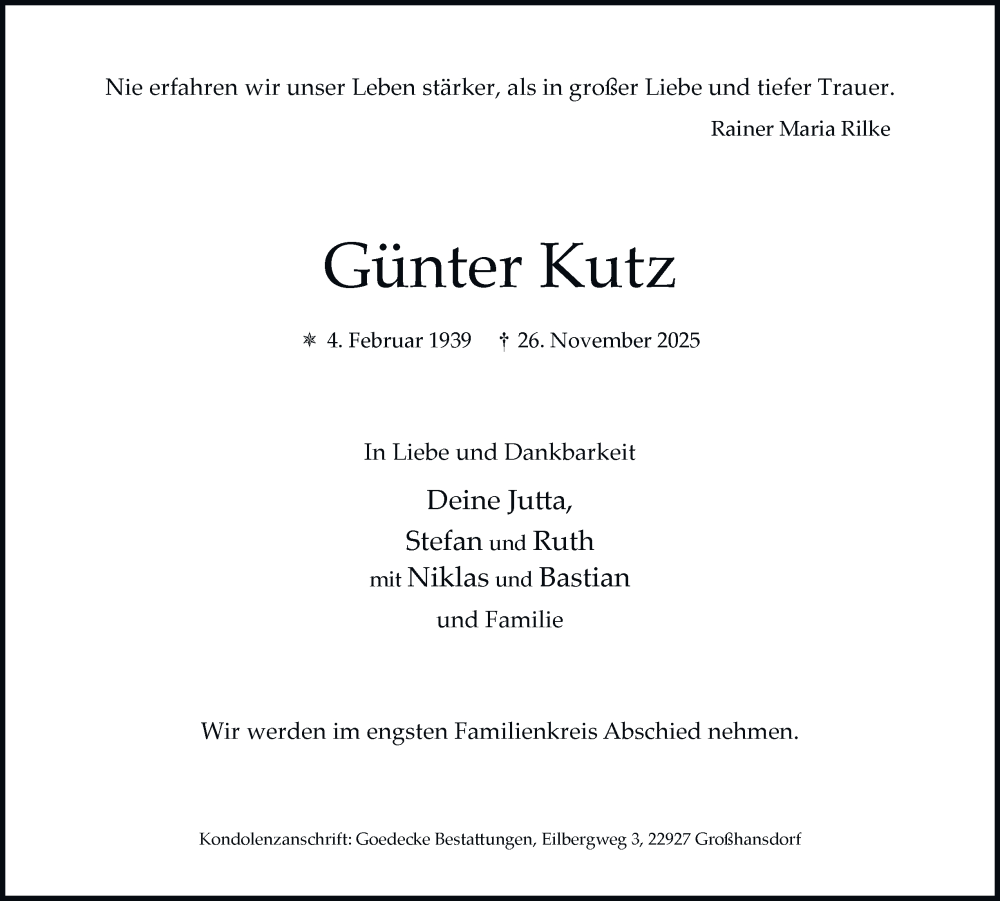 Hier finden Sie alle Traueranzeigen aus der Zeitung, die bisher für Günter Kutz erschienen sind. Weitere Traueranzeigen, die in der Zeitung erscheinen, werden hier ebenfalls aufgelistet
