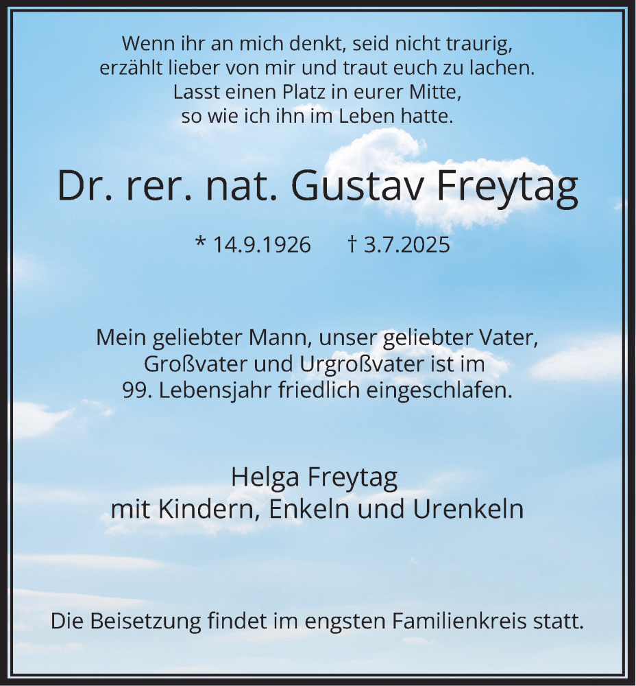 Hier finden Sie alle Traueranzeigen aus der Zeitung, die bisher für Gustav Freytag erschienen sind. Weitere Traueranzeigen, die in der Zeitung erscheinen, werden hier ebenfalls aufgelistet