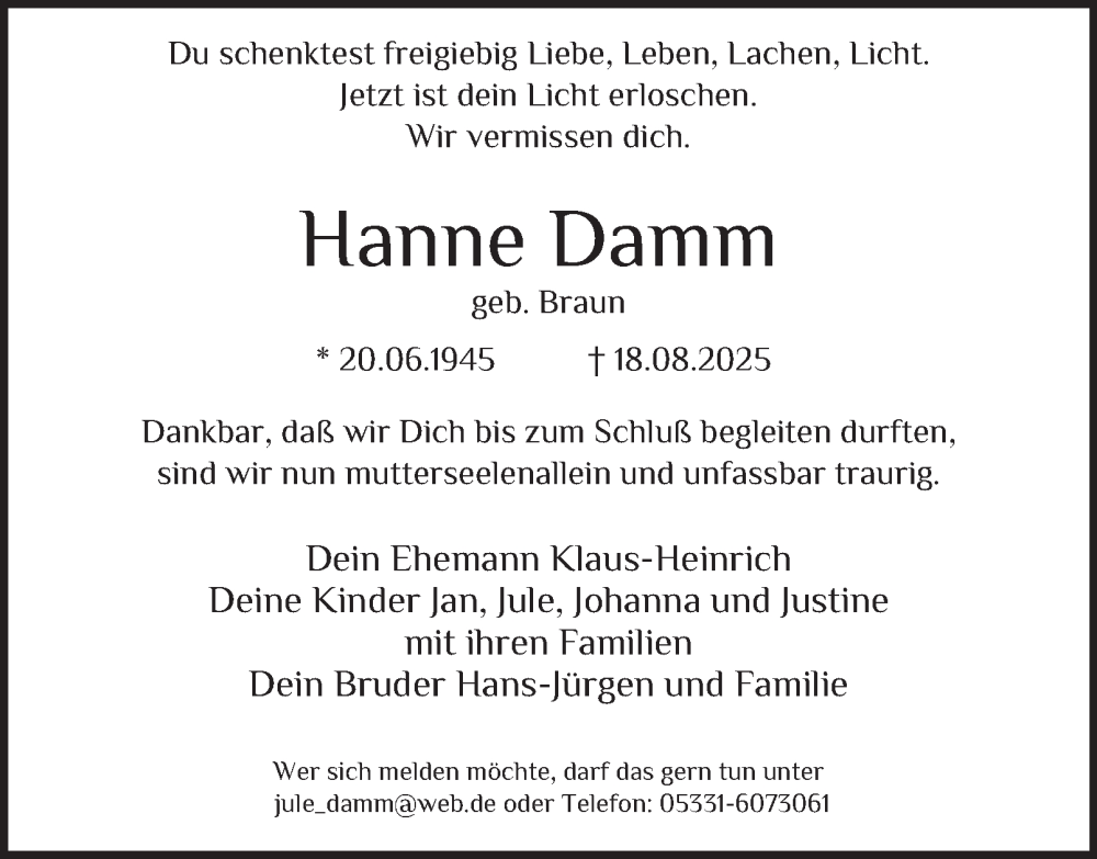 Hier finden Sie alle Traueranzeigen aus der Zeitung, die bisher für Hanne Damm erschienen sind. Weitere Traueranzeigen, die in der Zeitung erscheinen, werden hier ebenfalls aufgelistet