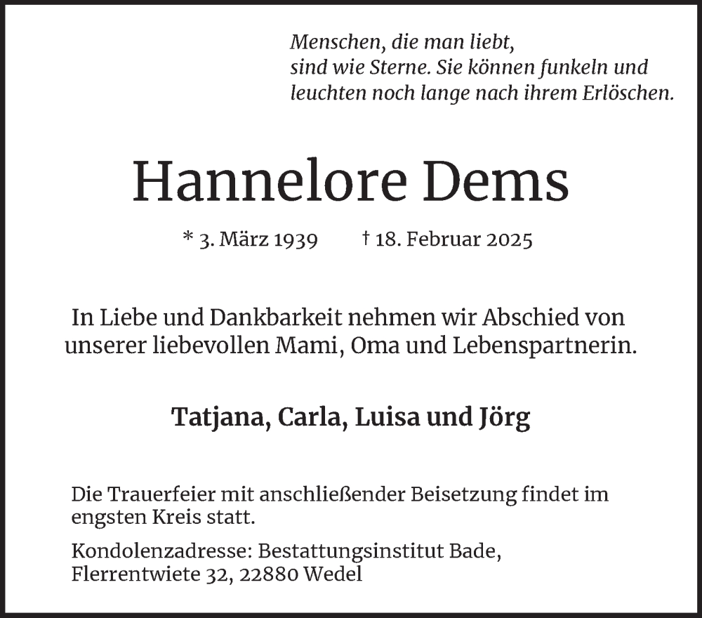 Hier finden Sie alle Traueranzeigen aus der Zeitung, die bisher für Hannelore Dems erschienen sind. Weitere Traueranzeigen, die in der Zeitung erscheinen, werden hier ebenfalls aufgelistet