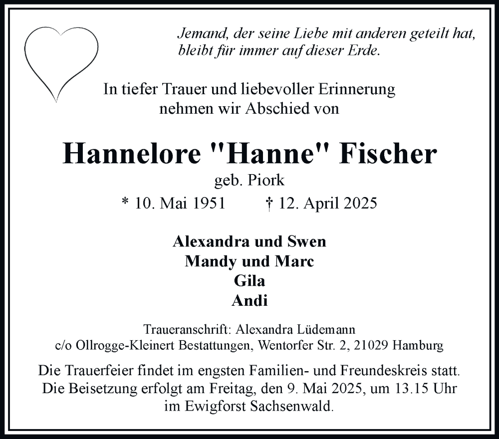 Hier finden Sie alle Traueranzeigen aus der Zeitung, die bisher für Hannelore Fischer erschienen sind. Weitere Traueranzeigen, die in der Zeitung erscheinen, werden hier ebenfalls aufgelistet
