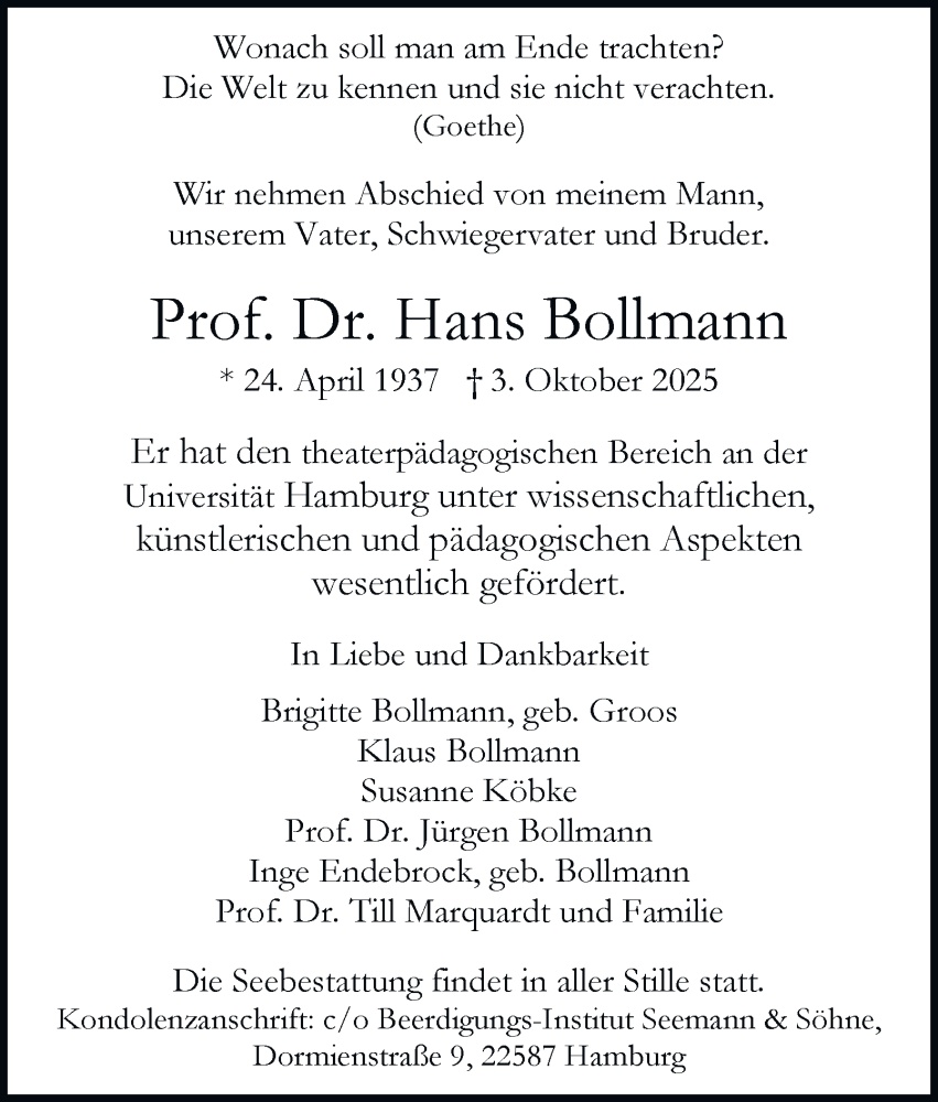 Hier finden Sie alle Traueranzeigen aus der Zeitung, die bisher für Hans Bollmann erschienen sind. Weitere Traueranzeigen, die in der Zeitung erscheinen, werden hier ebenfalls aufgelistet