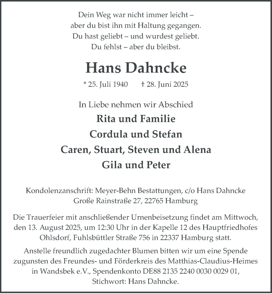 Hier finden Sie alle Traueranzeigen aus der Zeitung, die bisher für Hans Dahncke erschienen sind. Weitere Traueranzeigen, die in der Zeitung erscheinen, werden hier ebenfalls aufgelistet