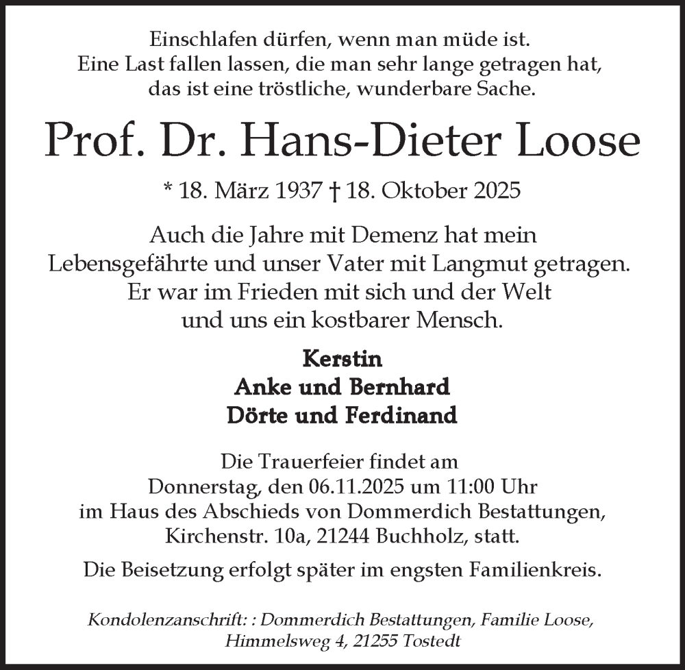 Hier finden Sie alle Traueranzeigen aus der Zeitung, die bisher für Hans-Dieter Loose erschienen sind. Weitere Traueranzeigen, die in der Zeitung erscheinen, werden hier ebenfalls aufgelistet