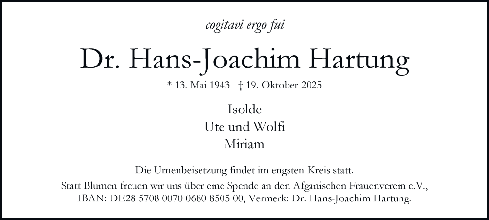 Hier finden Sie alle Traueranzeigen aus der Zeitung, die bisher für Hans-Joachim Hartung erschienen sind. Weitere Traueranzeigen, die in der Zeitung erscheinen, werden hier ebenfalls aufgelistet