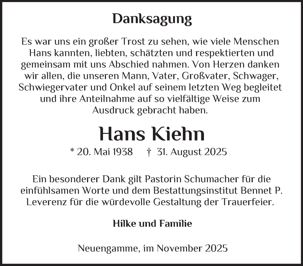 Hier finden Sie alle Traueranzeigen aus der Zeitung, die bisher für Hans Kiehn erschienen sind. Weitere Traueranzeigen, die in der Zeitung erscheinen, werden hier ebenfalls aufgelistet
