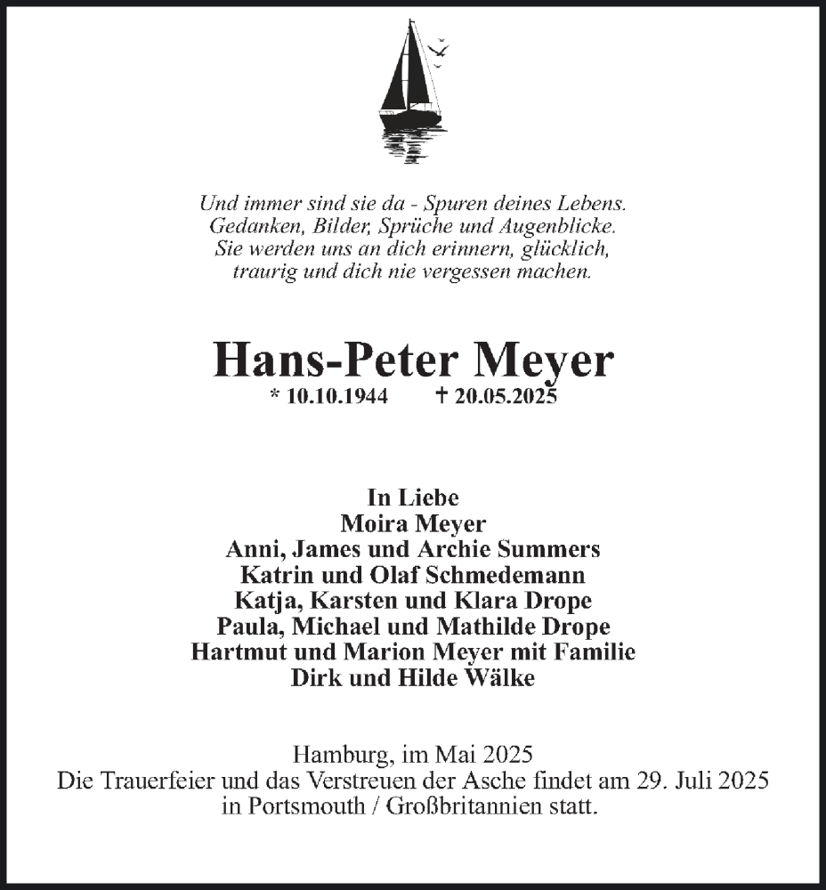 Hier finden Sie alle Traueranzeigen aus der Zeitung, die bisher für Hans-Peter Meyer erschienen sind. Weitere Traueranzeigen, die in der Zeitung erscheinen, werden hier ebenfalls aufgelistet