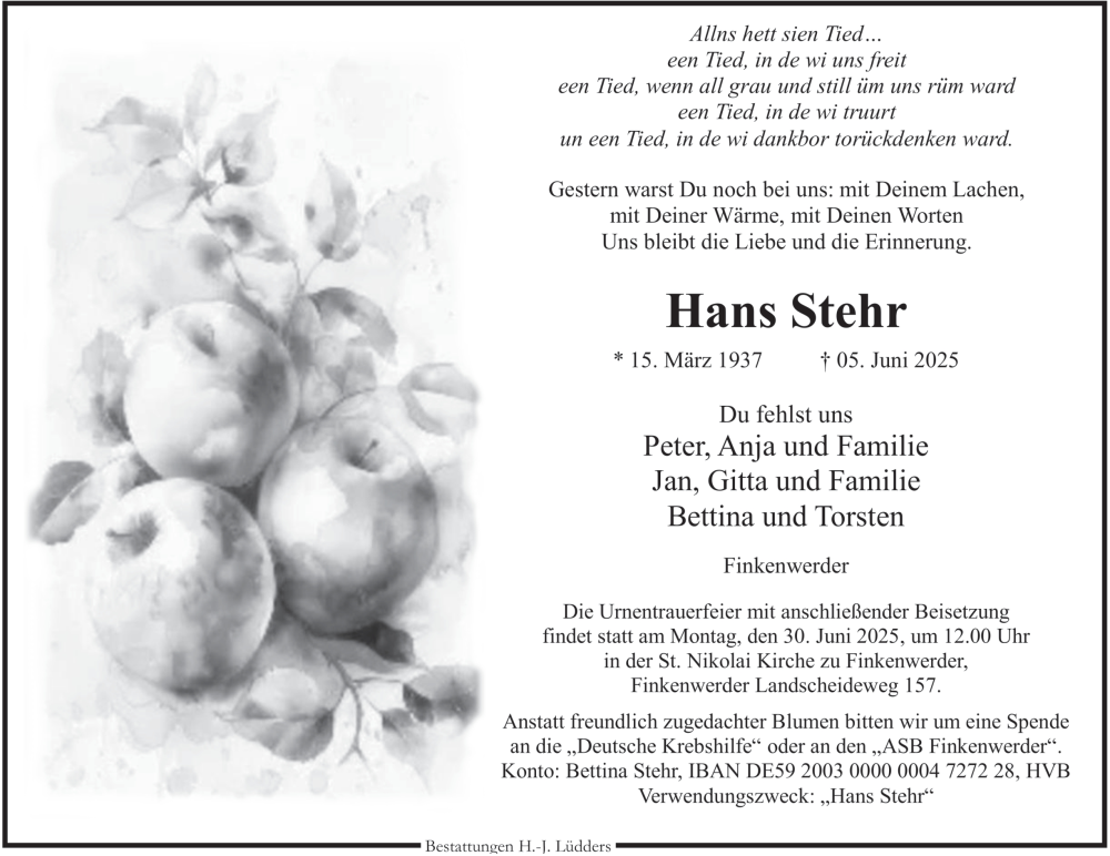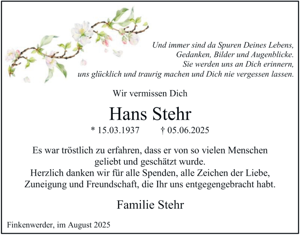Hier finden Sie alle Traueranzeigen aus der Zeitung, die bisher für Hans Stehr erschienen sind. Weitere Traueranzeigen, die in der Zeitung erscheinen, werden hier ebenfalls aufgelistet