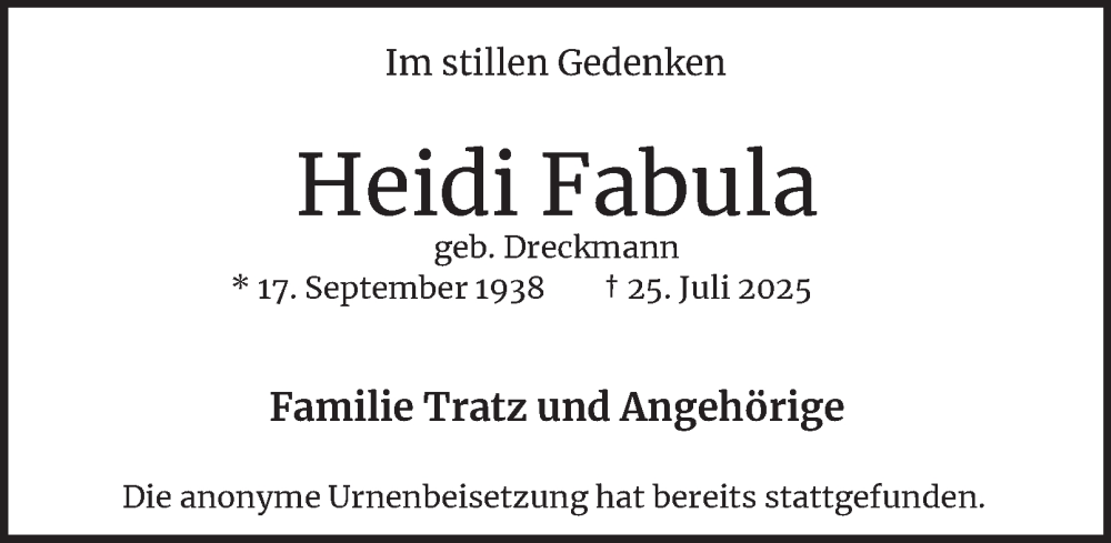 Hier finden Sie alle Traueranzeigen aus der Zeitung, die bisher für Heidi Fabula erschienen sind. Weitere Traueranzeigen, die in der Zeitung erscheinen, werden hier ebenfalls aufgelistet