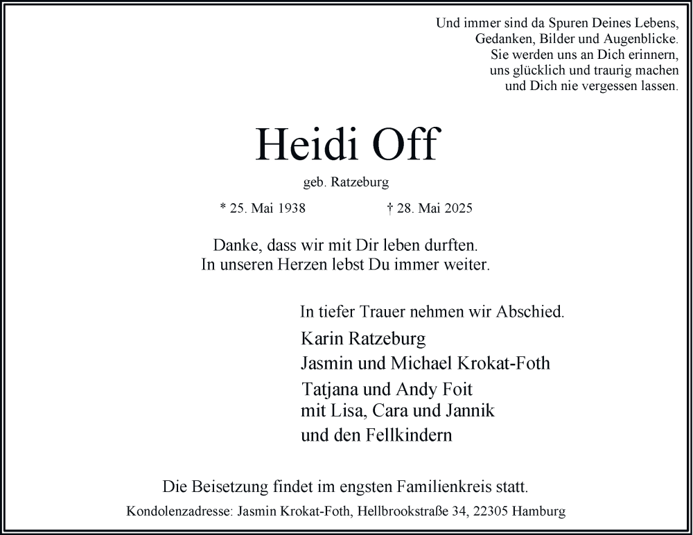 Hier finden Sie alle Traueranzeigen aus der Zeitung, die bisher für Heidi Off erschienen sind. Weitere Traueranzeigen, die in der Zeitung erscheinen, werden hier ebenfalls aufgelistet