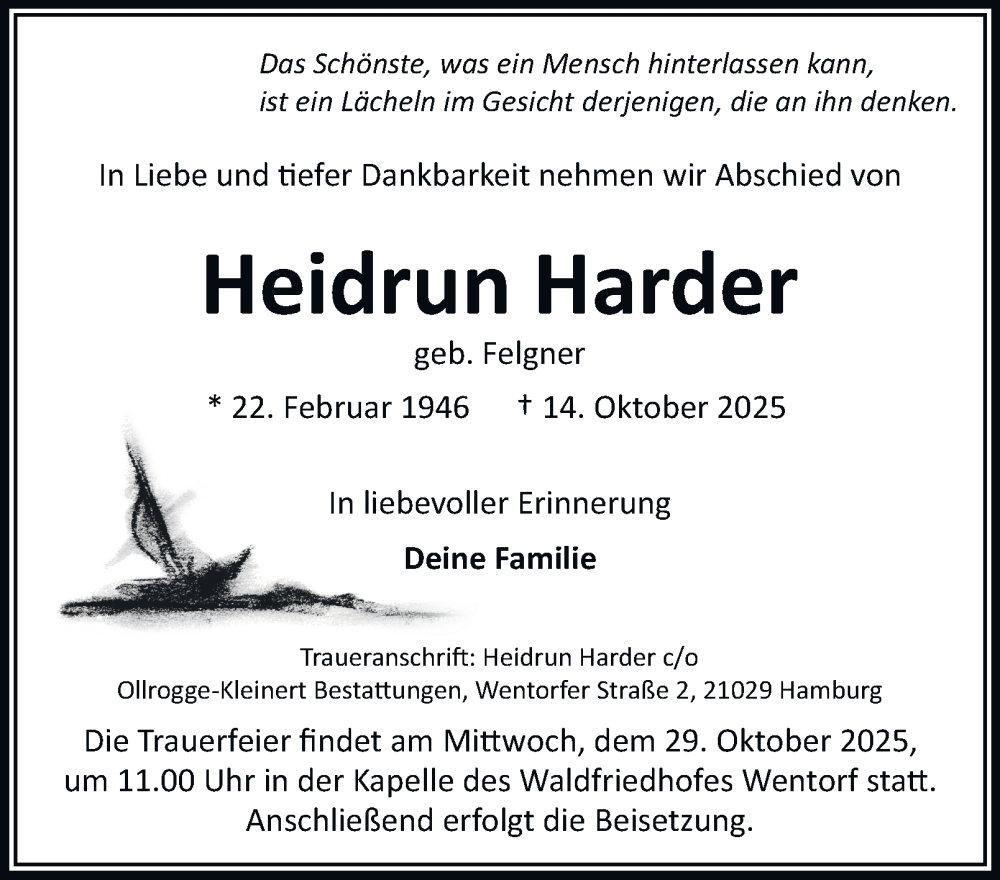 Hier finden Sie alle Traueranzeigen aus der Zeitung, die bisher für Heidrun Harder erschienen sind. Weitere Traueranzeigen, die in der Zeitung erscheinen, werden hier ebenfalls aufgelistet