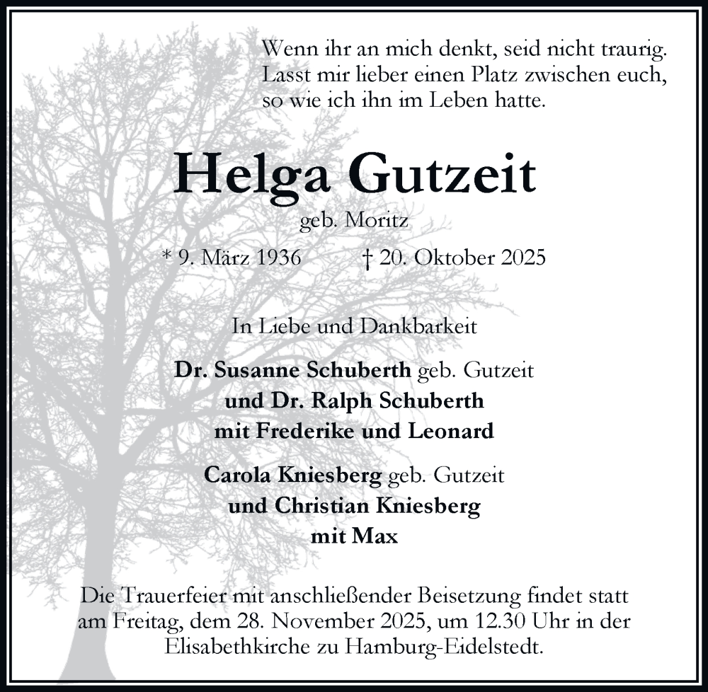 Hier finden Sie alle Traueranzeigen aus der Zeitung, die bisher für Helga Gutzeit erschienen sind. Weitere Traueranzeigen, die in der Zeitung erscheinen, werden hier ebenfalls aufgelistet