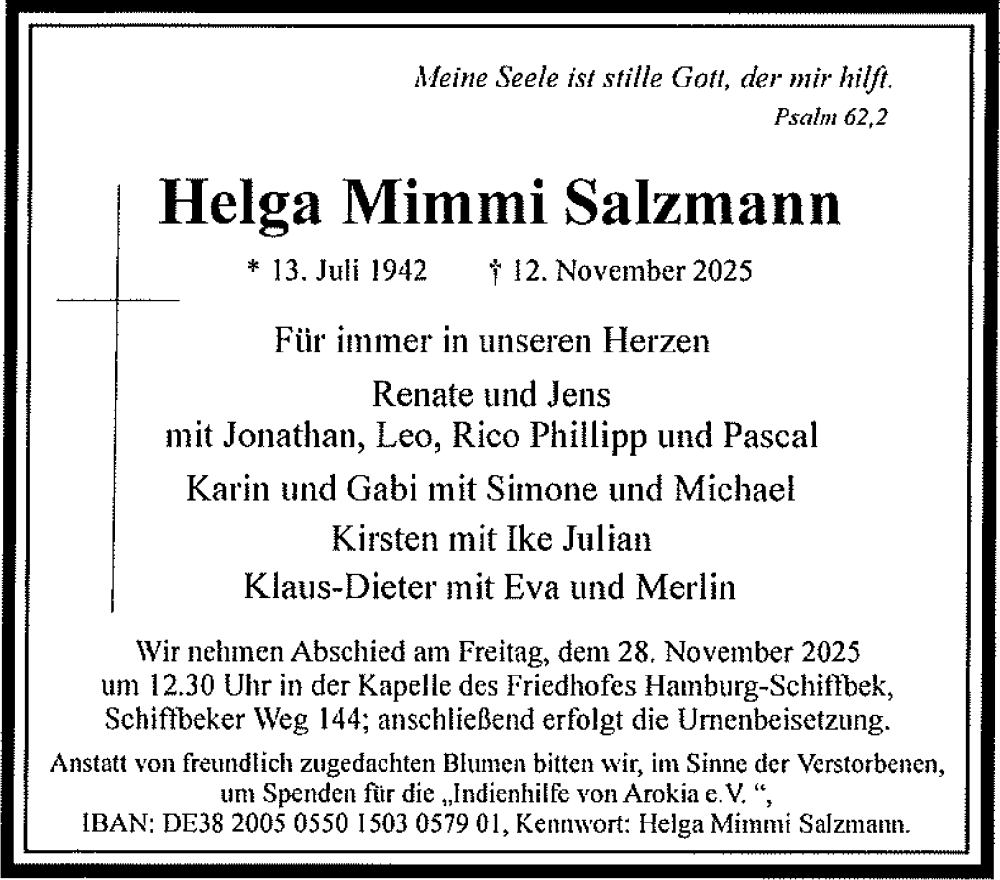 Hier finden Sie alle Traueranzeigen aus der Zeitung, die bisher für Helga Mimmi Salzmann erschienen sind. Weitere Traueranzeigen, die in der Zeitung erscheinen, werden hier ebenfalls aufgelistet