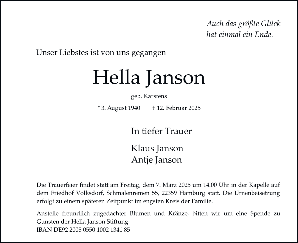 Hier finden Sie alle Traueranzeigen aus der Zeitung, die bisher für Hella Janson erschienen sind. Weitere Traueranzeigen, die in der Zeitung erscheinen, werden hier ebenfalls aufgelistet