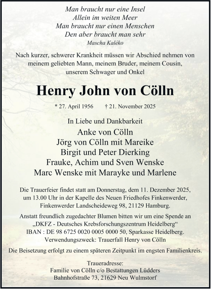 Hier finden Sie alle Traueranzeigen aus der Zeitung, die bisher für Henry John von Cölln erschienen sind. Weitere Traueranzeigen, die in der Zeitung erscheinen, werden hier ebenfalls aufgelistet