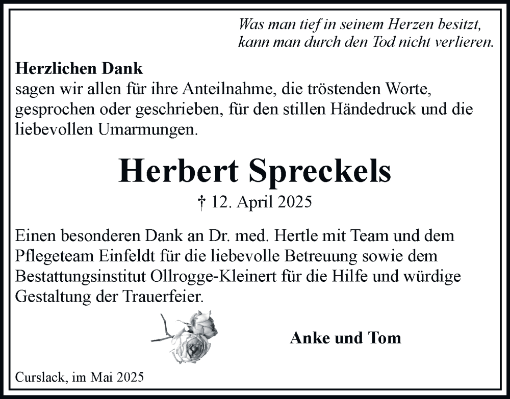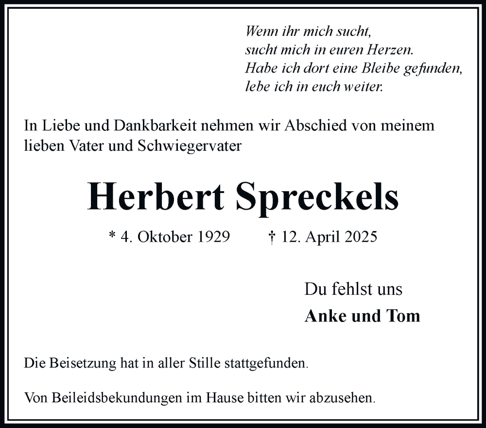 Hier finden Sie alle Traueranzeigen aus der Zeitung, die bisher für Herbert Spreckels erschienen sind. Weitere Traueranzeigen, die in der Zeitung erscheinen, werden hier ebenfalls aufgelistet
