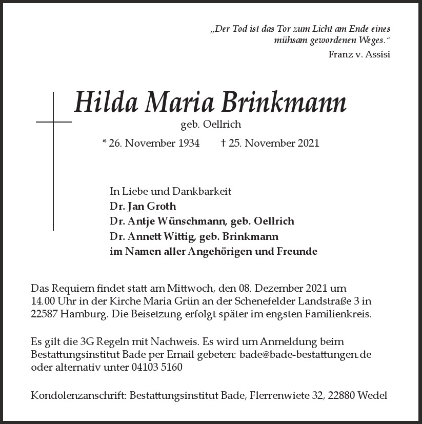 Hier finden Sie alle Traueranzeigen aus der Zeitung, die bisher für Hilda Maria Brinkmann erschienen sind. Weitere Traueranzeigen, die in der Zeitung erscheinen, werden hier ebenfalls aufgelistet