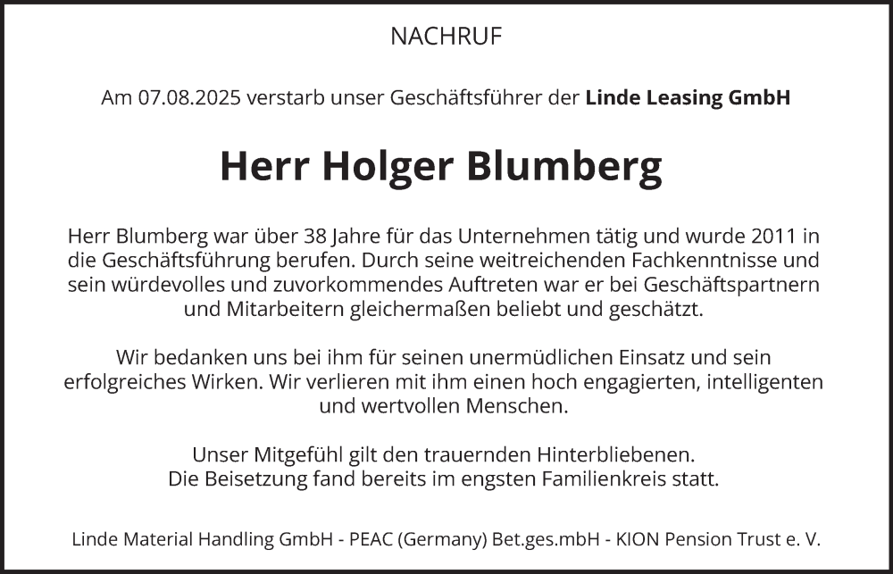 Hier finden Sie alle Traueranzeigen aus der Zeitung, die bisher für Holger Blumberg erschienen sind. Weitere Traueranzeigen, die in der Zeitung erscheinen, werden hier ebenfalls aufgelistet