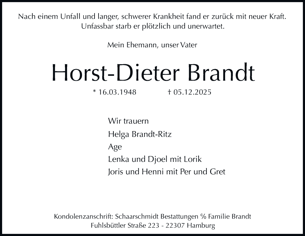 Hier finden Sie alle Traueranzeigen aus der Zeitung, die bisher für Horst-Dieter Brandt erschienen sind. Weitere Traueranzeigen, die in der Zeitung erscheinen, werden hier ebenfalls aufgelistet