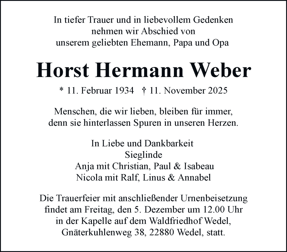 Hier finden Sie alle Traueranzeigen aus der Zeitung, die bisher für Horst Hermann Weber erschienen sind. Weitere Traueranzeigen, die in der Zeitung erscheinen, werden hier ebenfalls aufgelistet