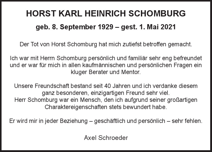 Hier finden Sie alle Traueranzeigen aus der Zeitung, die bisher für HORST KARL HEINRICH SCHOMBURG erschienen sind. Weitere Traueranzeigen, die in der Zeitung erscheinen, werden hier ebenfalls aufgelistet