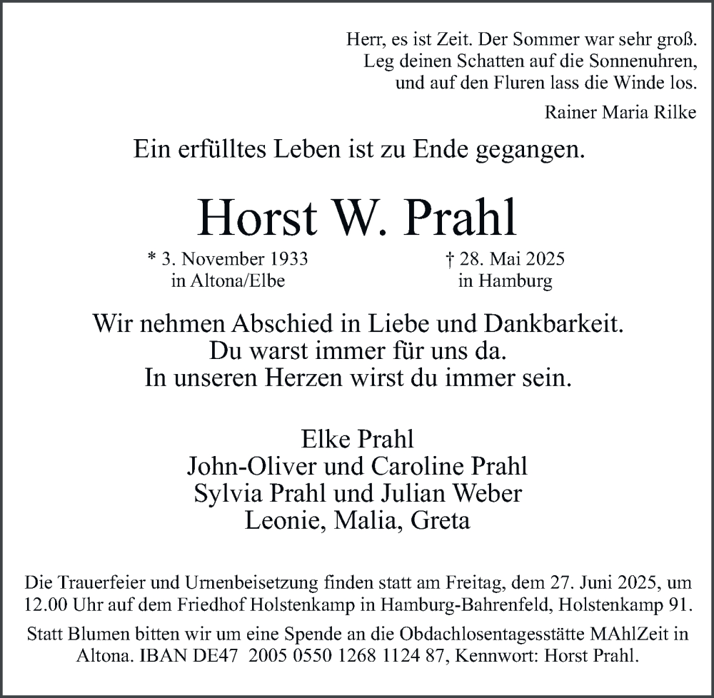Hier finden Sie alle Traueranzeigen aus der Zeitung, die bisher für Horst Prahl erschienen sind. Weitere Traueranzeigen, die in der Zeitung erscheinen, werden hier ebenfalls aufgelistet