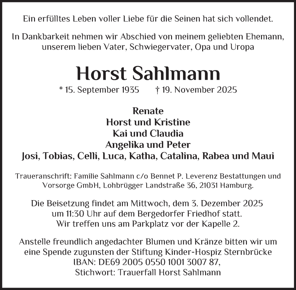 Hier finden Sie alle Traueranzeigen aus der Zeitung, die bisher für Horst Sahlmann erschienen sind. Weitere Traueranzeigen, die in der Zeitung erscheinen, werden hier ebenfalls aufgelistet