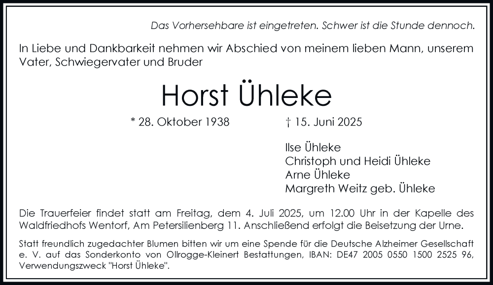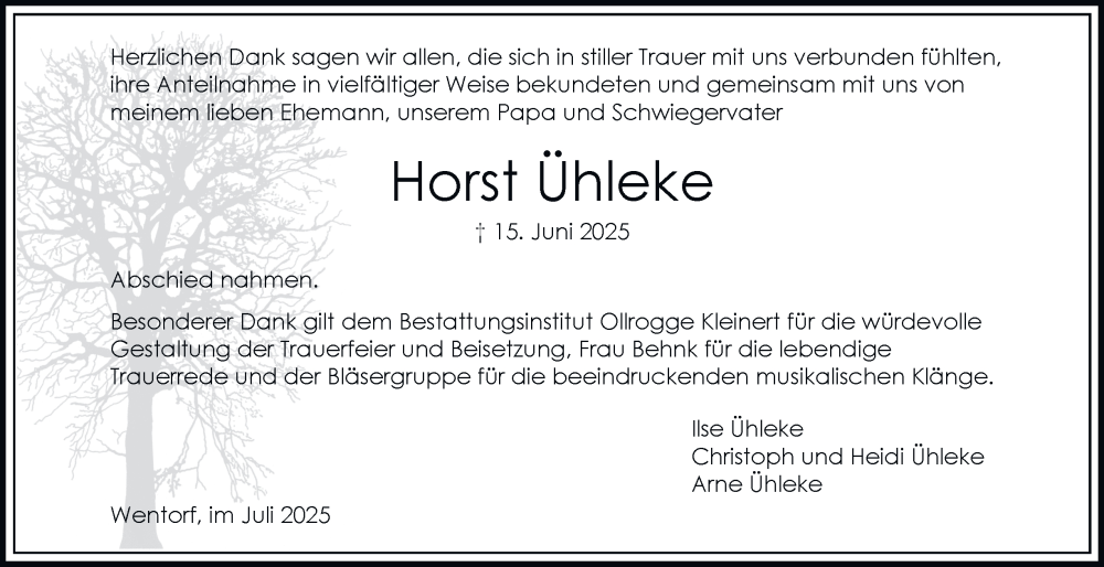 Hier finden Sie alle Traueranzeigen aus der Zeitung, die bisher für Horst Ühleke erschienen sind. Weitere Traueranzeigen, die in der Zeitung erscheinen, werden hier ebenfalls aufgelistet
