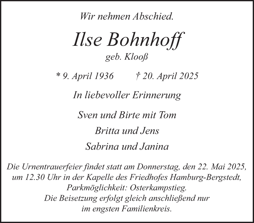 Hier finden Sie alle Traueranzeigen aus der Zeitung, die bisher für Ilse Bohnhoff erschienen sind. Weitere Traueranzeigen, die in der Zeitung erscheinen, werden hier ebenfalls aufgelistet