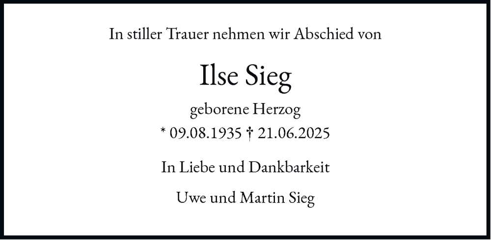 Hier finden Sie alle Traueranzeigen aus der Zeitung, die bisher für Ilse Sieg erschienen sind. Weitere Traueranzeigen, die in der Zeitung erscheinen, werden hier ebenfalls aufgelistet