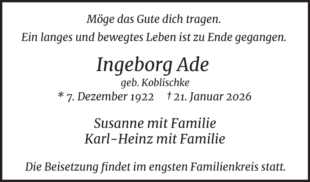 Hier finden Sie alle Traueranzeigen aus der Zeitung, die bisher für Ingeborg Ade erschienen sind. Weitere Traueranzeigen, die in der Zeitung erscheinen, werden hier ebenfalls aufgelistet