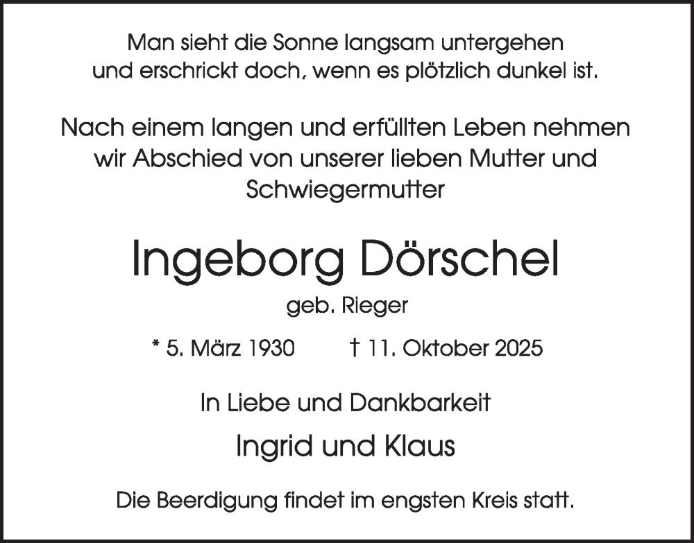 Hier finden Sie alle Traueranzeigen aus der Zeitung, die bisher für Ingeborg Dörschel erschienen sind. Weitere Traueranzeigen, die in der Zeitung erscheinen, werden hier ebenfalls aufgelistet