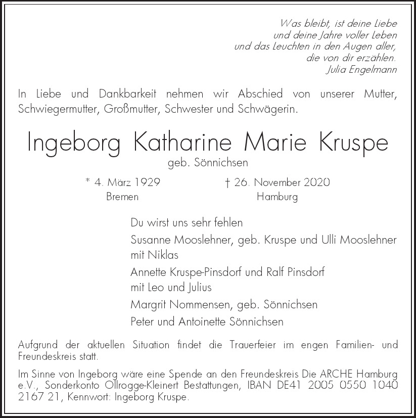 Hier finden Sie alle Traueranzeigen aus der Zeitung, die bisher für Ingeborg Katharine Marie Kruspe erschienen sind. Weitere Traueranzeigen, die in der Zeitung erscheinen, werden hier ebenfalls aufgelistet