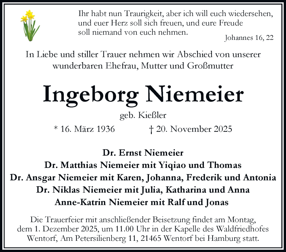 Hier finden Sie alle Traueranzeigen aus der Zeitung, die bisher für Ingeborg Niemeier erschienen sind. Weitere Traueranzeigen, die in der Zeitung erscheinen, werden hier ebenfalls aufgelistet