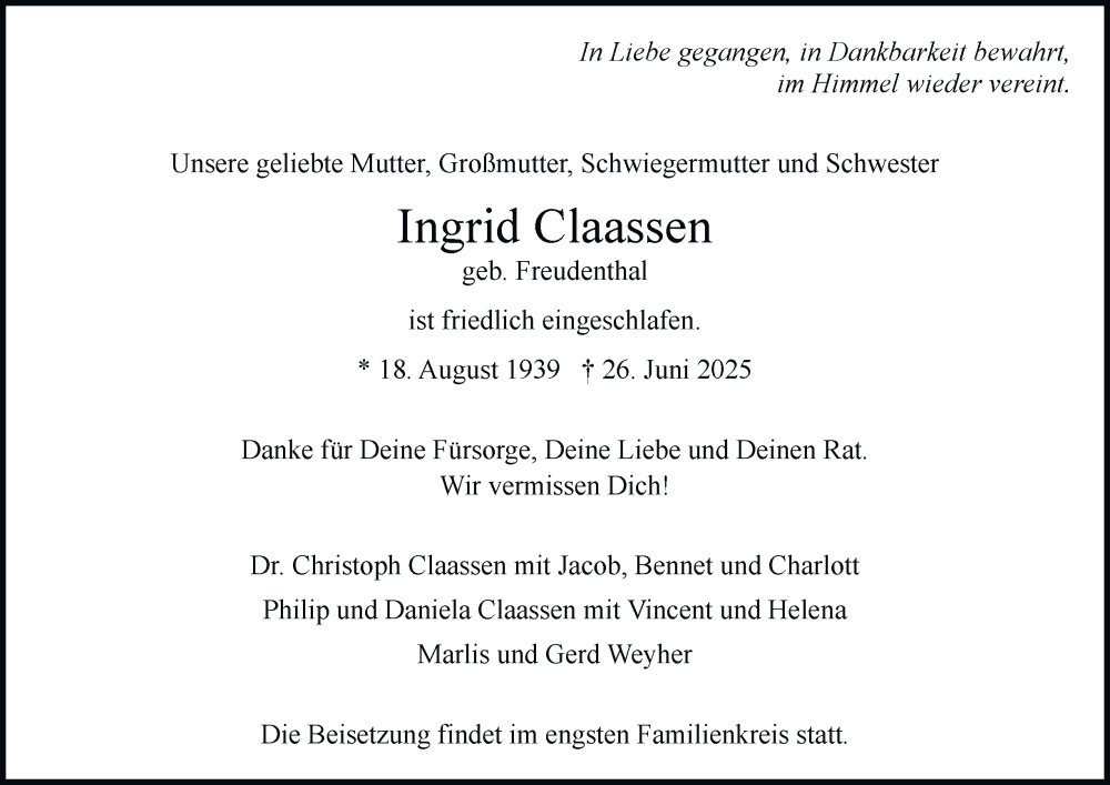 Hier finden Sie alle Traueranzeigen aus der Zeitung, die bisher für Ingrid Claassen erschienen sind. Weitere Traueranzeigen, die in der Zeitung erscheinen, werden hier ebenfalls aufgelistet