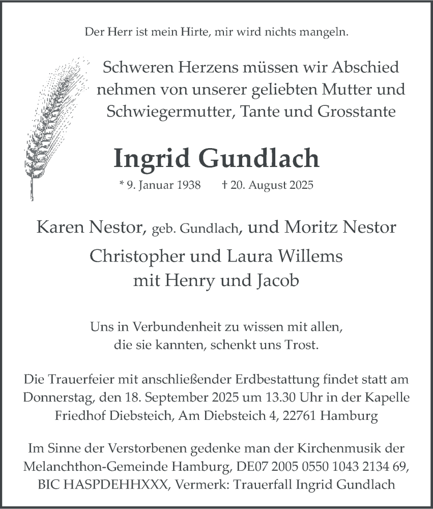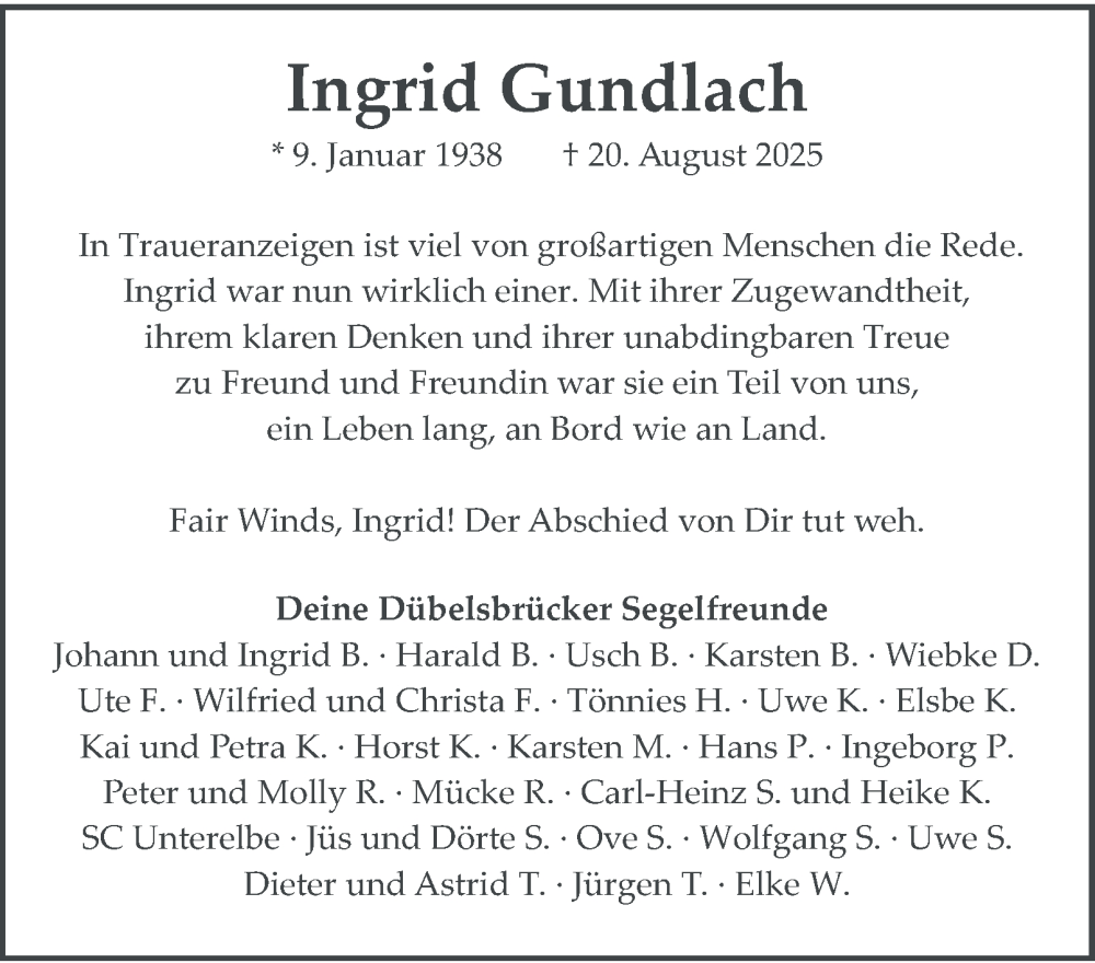 Hier finden Sie alle Traueranzeigen aus der Zeitung, die bisher für Ingrid Gundlach erschienen sind. Weitere Traueranzeigen, die in der Zeitung erscheinen, werden hier ebenfalls aufgelistet