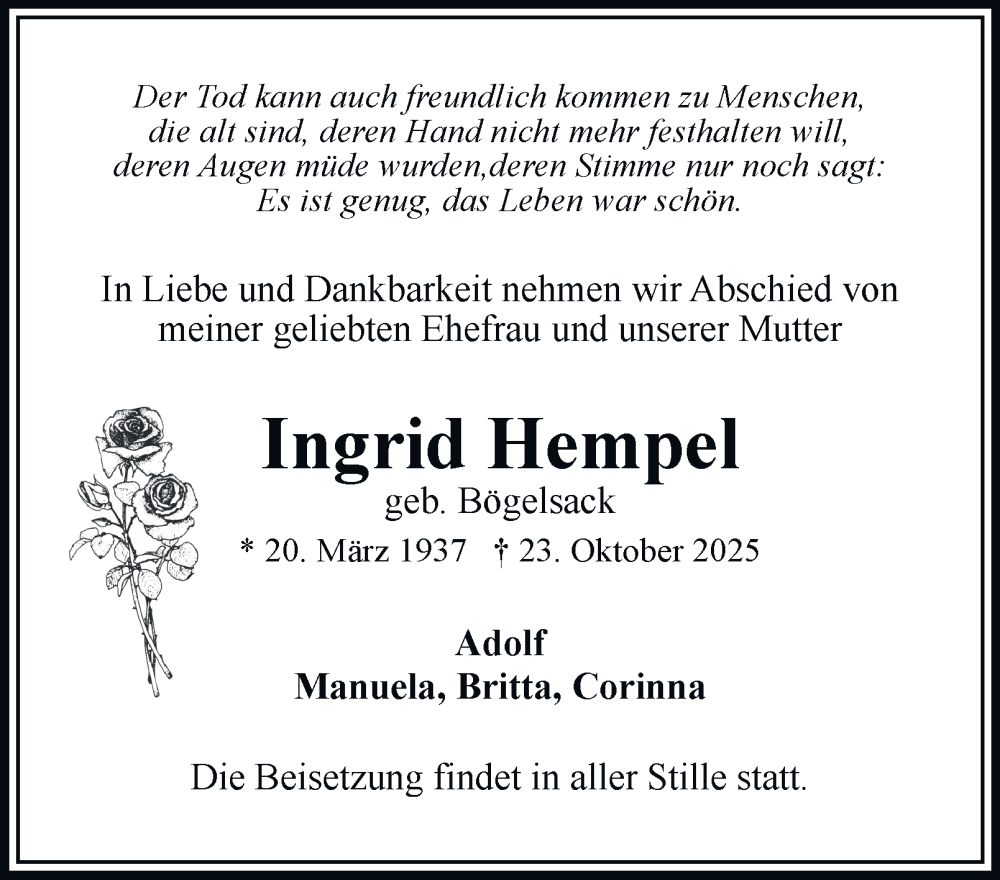 Hier finden Sie alle Traueranzeigen aus der Zeitung, die bisher für Ingrid Hempel erschienen sind. Weitere Traueranzeigen, die in der Zeitung erscheinen, werden hier ebenfalls aufgelistet