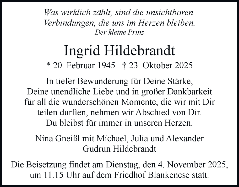 Hier finden Sie alle Traueranzeigen aus der Zeitung, die bisher für Ingrid Hildebrandt erschienen sind. Weitere Traueranzeigen, die in der Zeitung erscheinen, werden hier ebenfalls aufgelistet