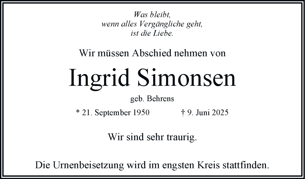 Hier finden Sie alle Traueranzeigen aus der Zeitung, die bisher für Ingrid Simonsen erschienen sind. Weitere Traueranzeigen, die in der Zeitung erscheinen, werden hier ebenfalls aufgelistet
