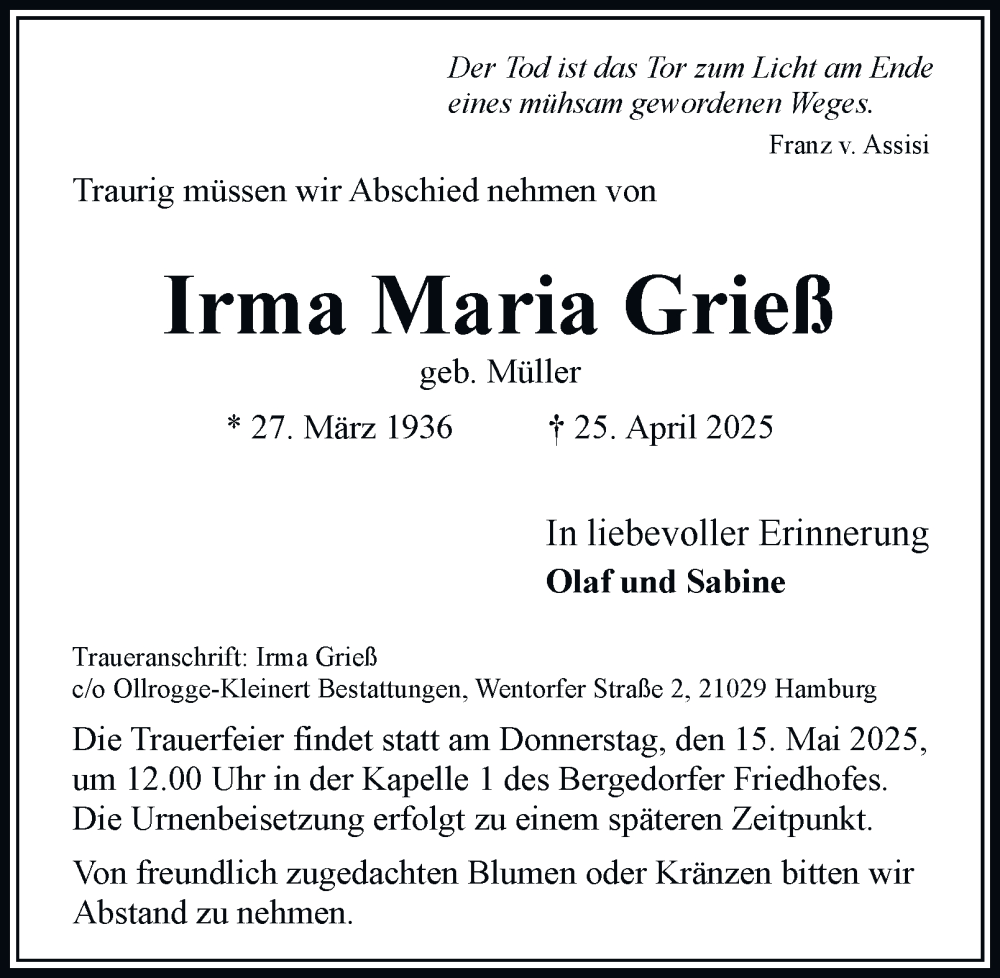 Hier finden Sie alle Traueranzeigen aus der Zeitung, die bisher für Irma Maria Grieß erschienen sind. Weitere Traueranzeigen, die in der Zeitung erscheinen, werden hier ebenfalls aufgelistet