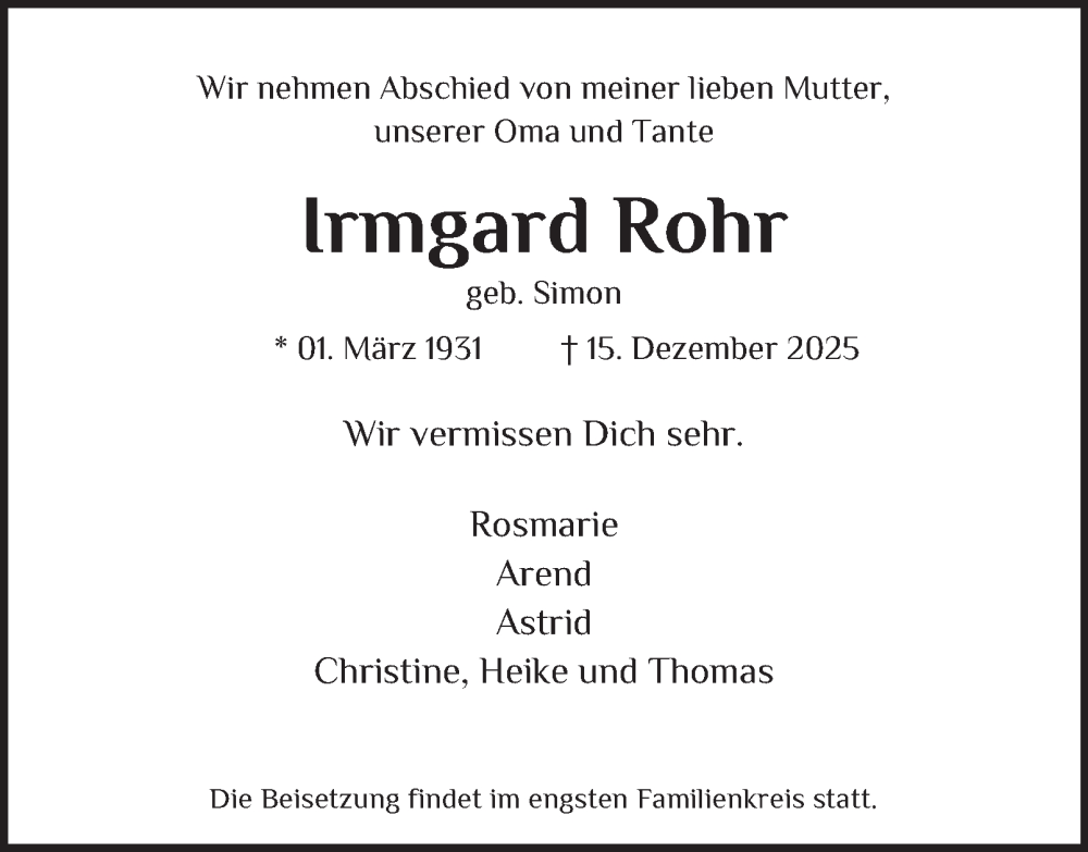 Hier finden Sie alle Traueranzeigen aus der Zeitung, die bisher für Irmgard Rohr erschienen sind. Weitere Traueranzeigen, die in der Zeitung erscheinen, werden hier ebenfalls aufgelistet