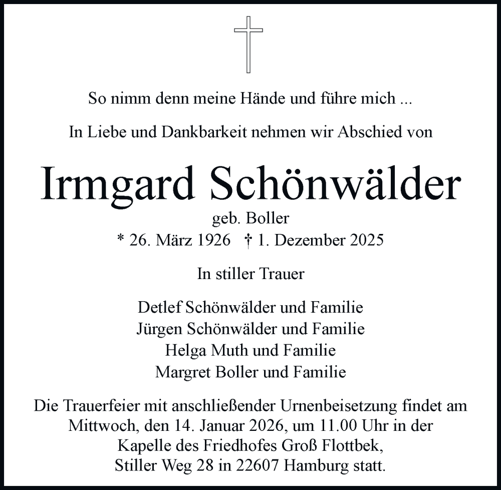 Hier finden Sie alle Traueranzeigen aus der Zeitung, die bisher für Irmgard Schönwälder erschienen sind. Weitere Traueranzeigen, die in der Zeitung erscheinen, werden hier ebenfalls aufgelistet