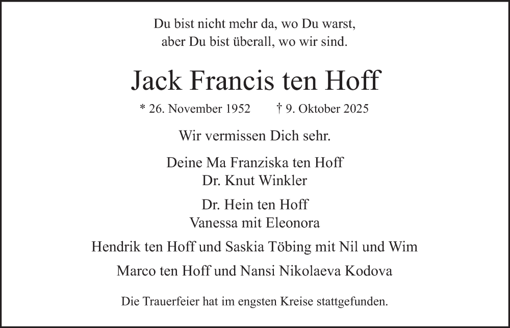 Hier finden Sie alle Traueranzeigen aus der Zeitung, die bisher für Jack Francis ten Hoff erschienen sind. Weitere Traueranzeigen, die in der Zeitung erscheinen, werden hier ebenfalls aufgelistet