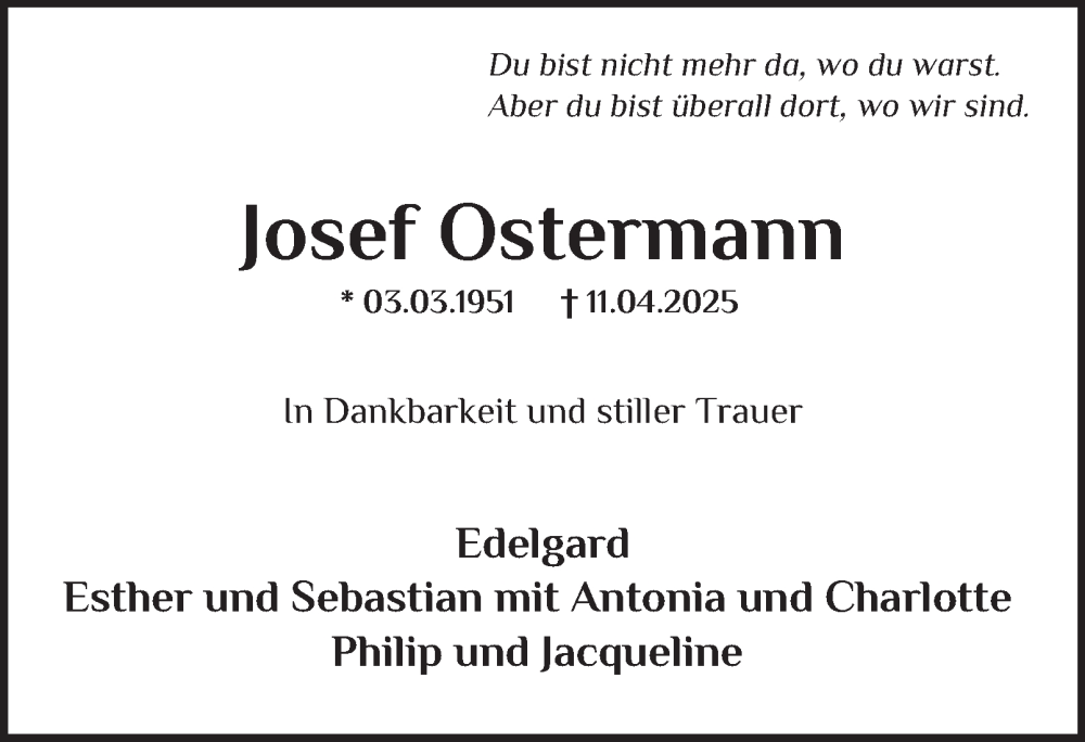 Hier finden Sie alle Traueranzeigen aus der Zeitung, die bisher für Josef Ostermann erschienen sind. Weitere Traueranzeigen, die in der Zeitung erscheinen, werden hier ebenfalls aufgelistet