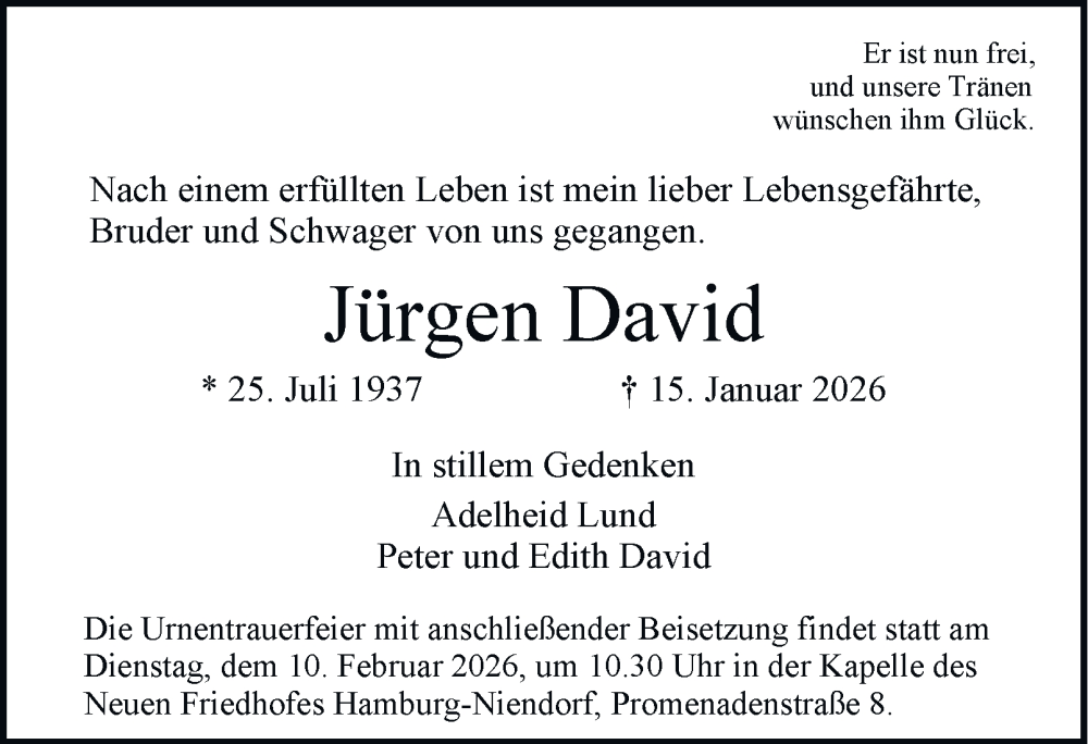 Hier finden Sie alle Traueranzeigen aus der Zeitung, die bisher für Jürgen David erschienen sind. Weitere Traueranzeigen, die in der Zeitung erscheinen, werden hier ebenfalls aufgelistet
