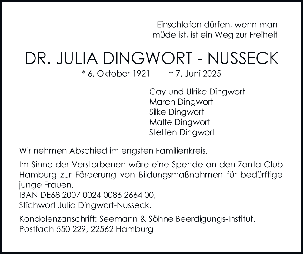 Hier finden Sie alle Traueranzeigen aus der Zeitung, die bisher für Julia Dingwort-Nusseck erschienen sind. Weitere Traueranzeigen, die in der Zeitung erscheinen, werden hier ebenfalls aufgelistet