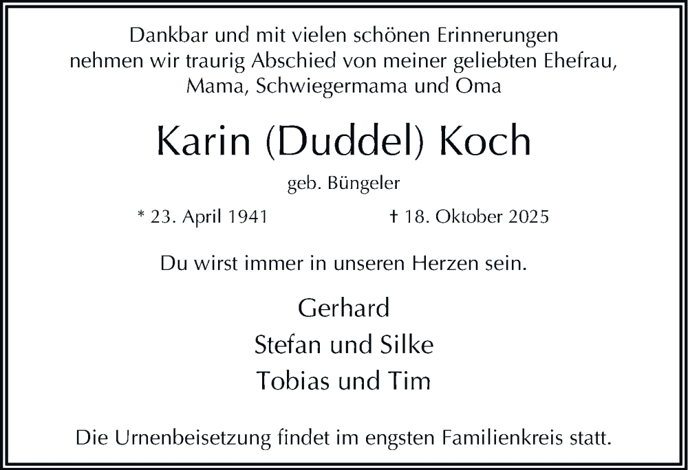 Hier finden Sie alle Traueranzeigen aus der Zeitung, die bisher für Karin Koch erschienen sind. Weitere Traueranzeigen, die in der Zeitung erscheinen, werden hier ebenfalls aufgelistet